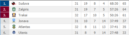 Lietuvos čempionato turnyrinė lentelė po lapkričio 12 dienos varžybų: