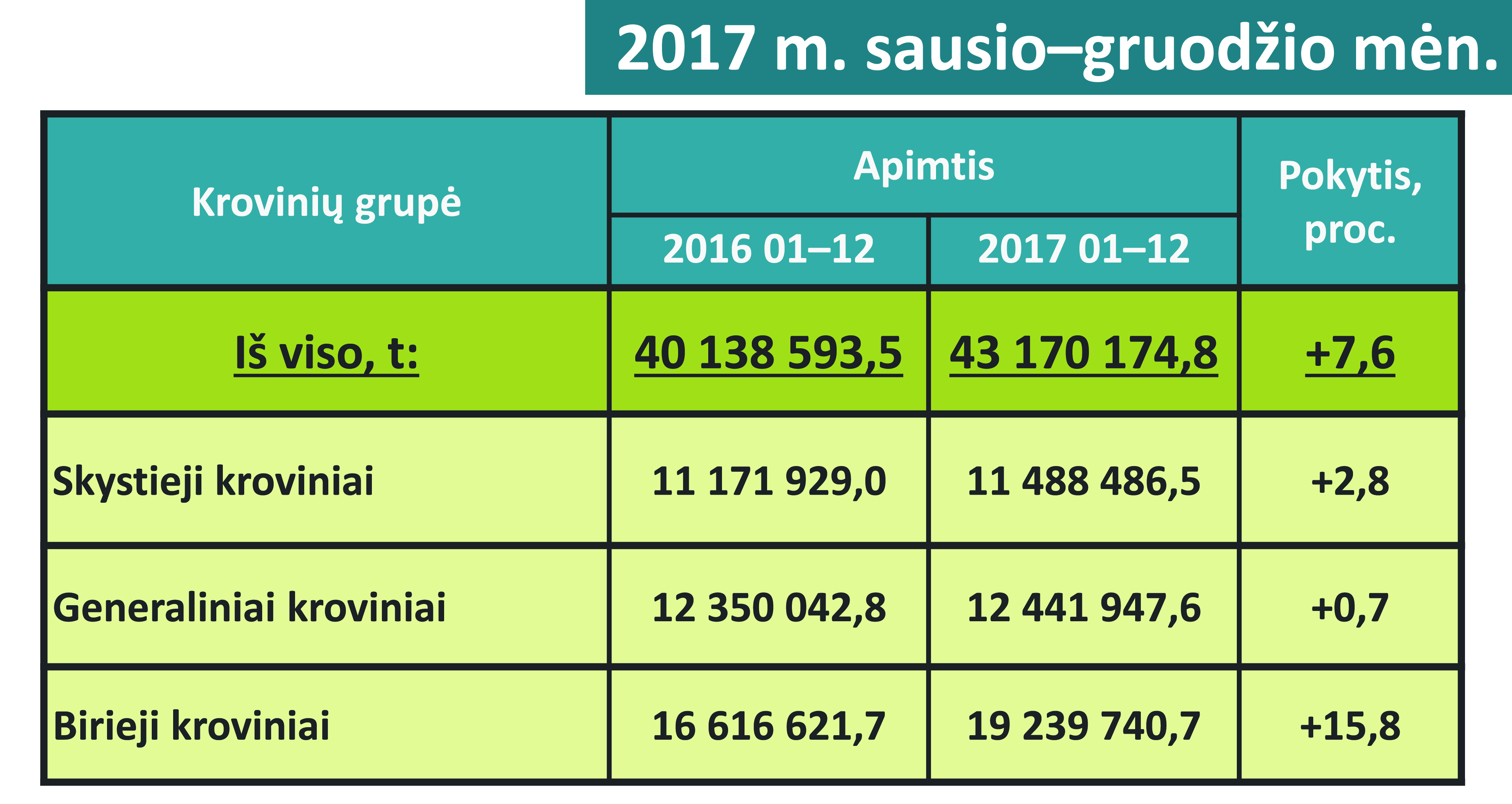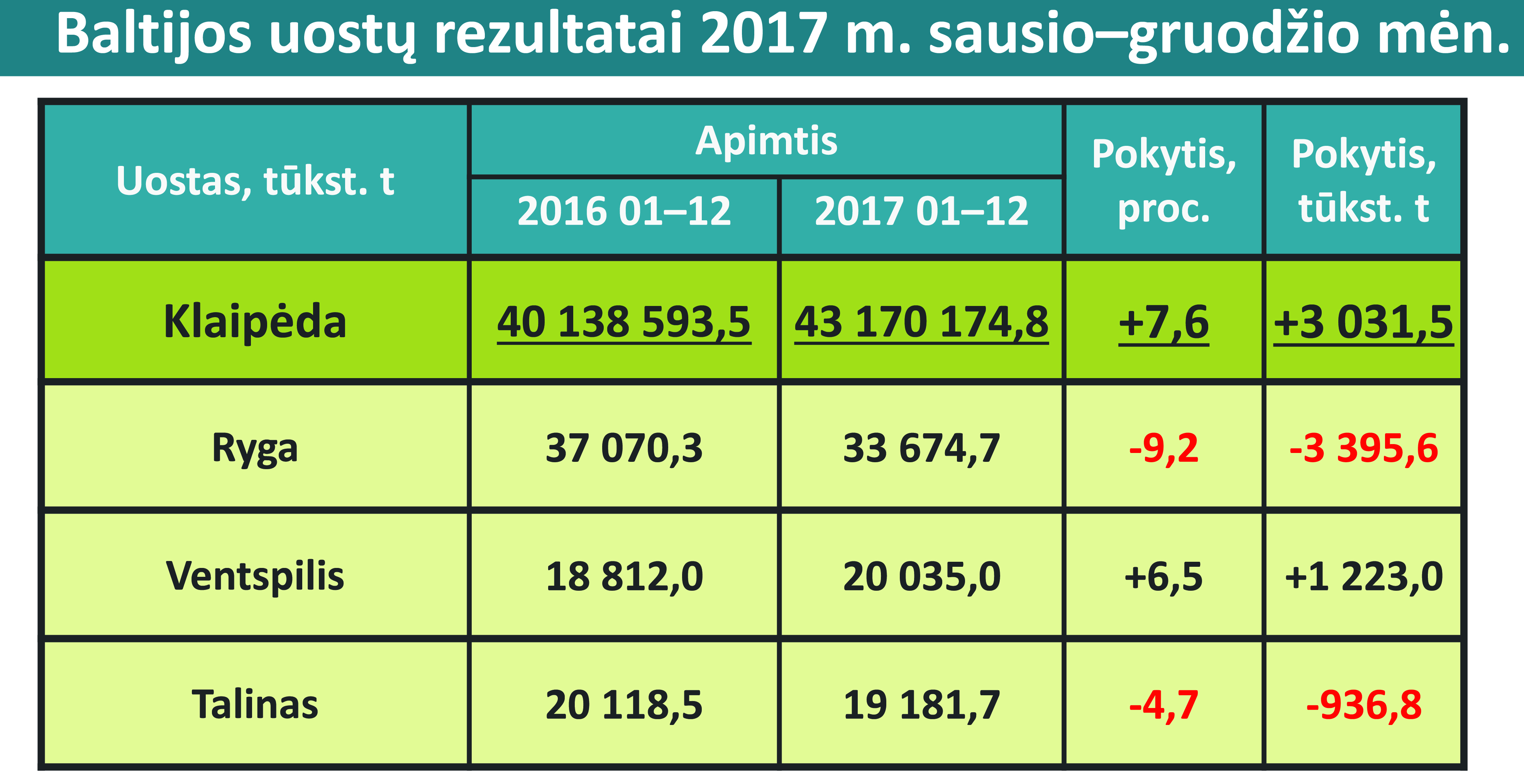 Per visus 2017-uosius Klaipėdos uoste perkrauta 43,01 mln. t krovinių – 7,2 proc. arba 2,87 mln. t daugiau nei 2016 m. Taip buvo pasiektas naujas metinis krovos rekordas. Daugiausia augo birių trąšų krova – pasiektas jos rekordas. Taip pat rekordai fiksuoti kraunant žemės produktus ir konteinerizuotus krovinius.