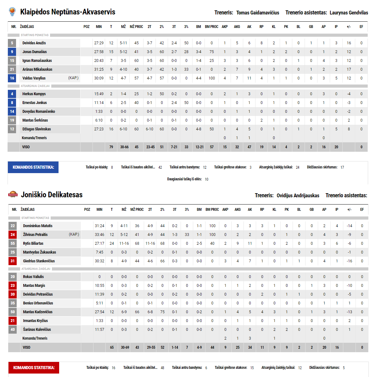„Neptūnas-Akvaservis“: Džiugas Slavinskas 16 (6/10 dvit.), Jonas Dumašius 15, Deividas Anužis ir Valdas Vasylius (11 atk. kam., 26 naud. bal.) po 12.
