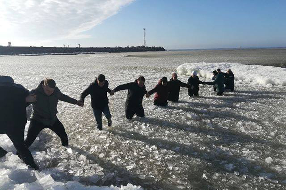 „Pirmiausia rankom padarėm virvę, grandinę, nuėjome iki tos ledo salos, kur buvo moteris, ji įsikibo į kraštinio vyro ranką, taip ją ištraukėme“, – pasakojo karys. „Facebook” nuotr.