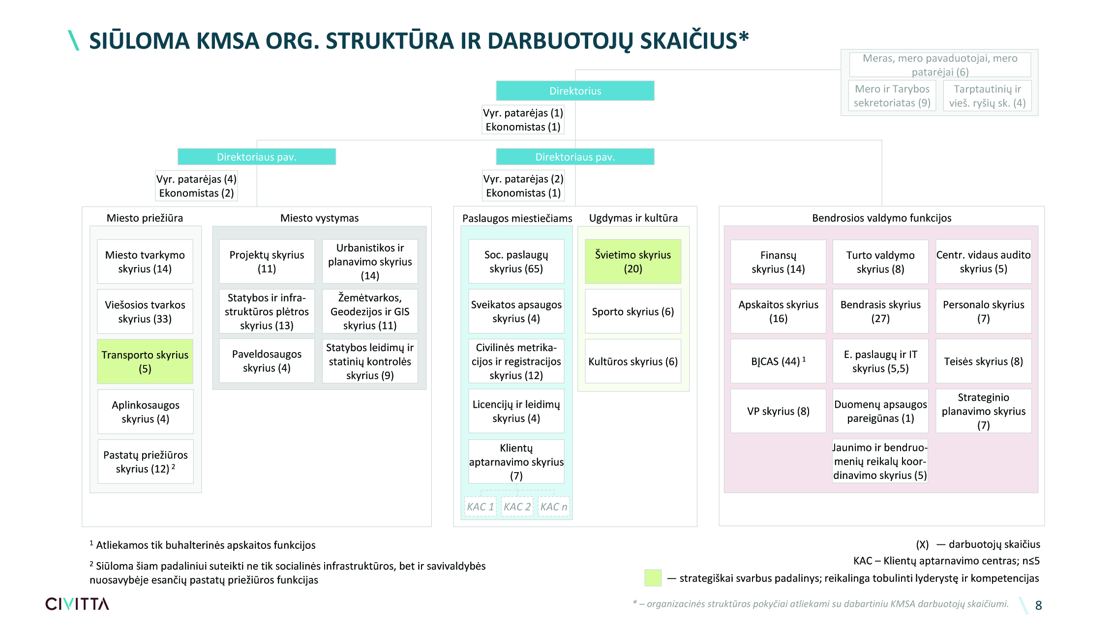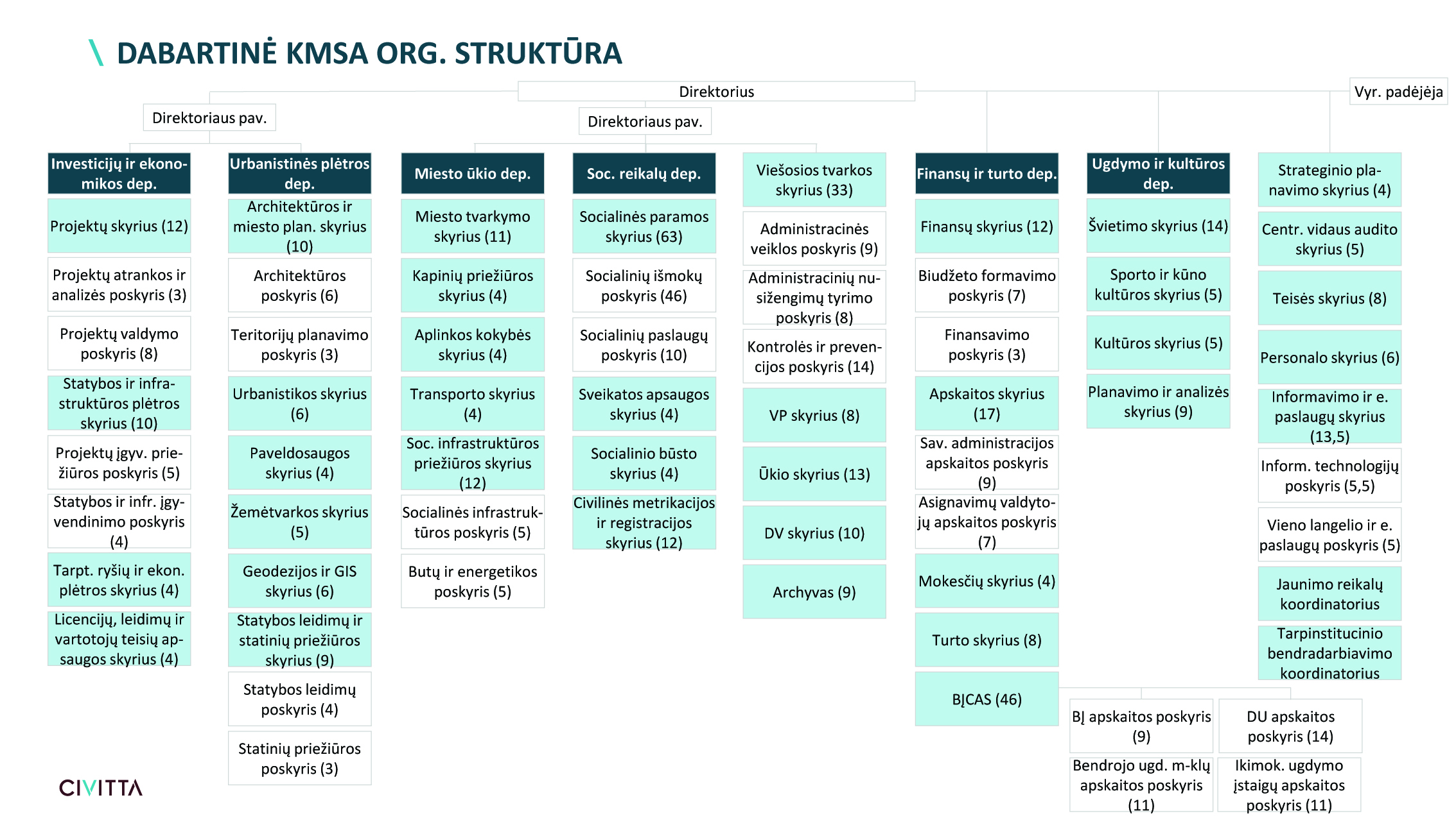 „Civitta” nuomone, administracijos padaliniai turėtų būti stambinami, atsisakant departamentų ir poskyrių, „plokštinanti” vadovų grandies struktūrą. Departamentų vadovams turėtų būti suteikta galimybė tapti vyr. patarėjais, o poskyrių vedėjams – patarėjais.