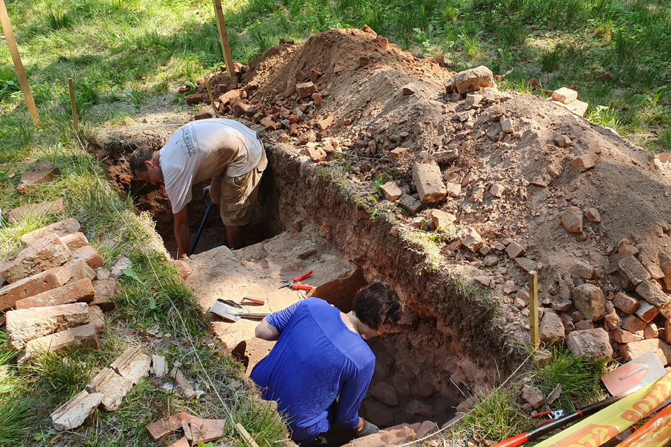 Archeologai darbuojasi ties bažnyčios pamatais, šalia buvusio bokšto. Martyno Vainoriaus nuotr.