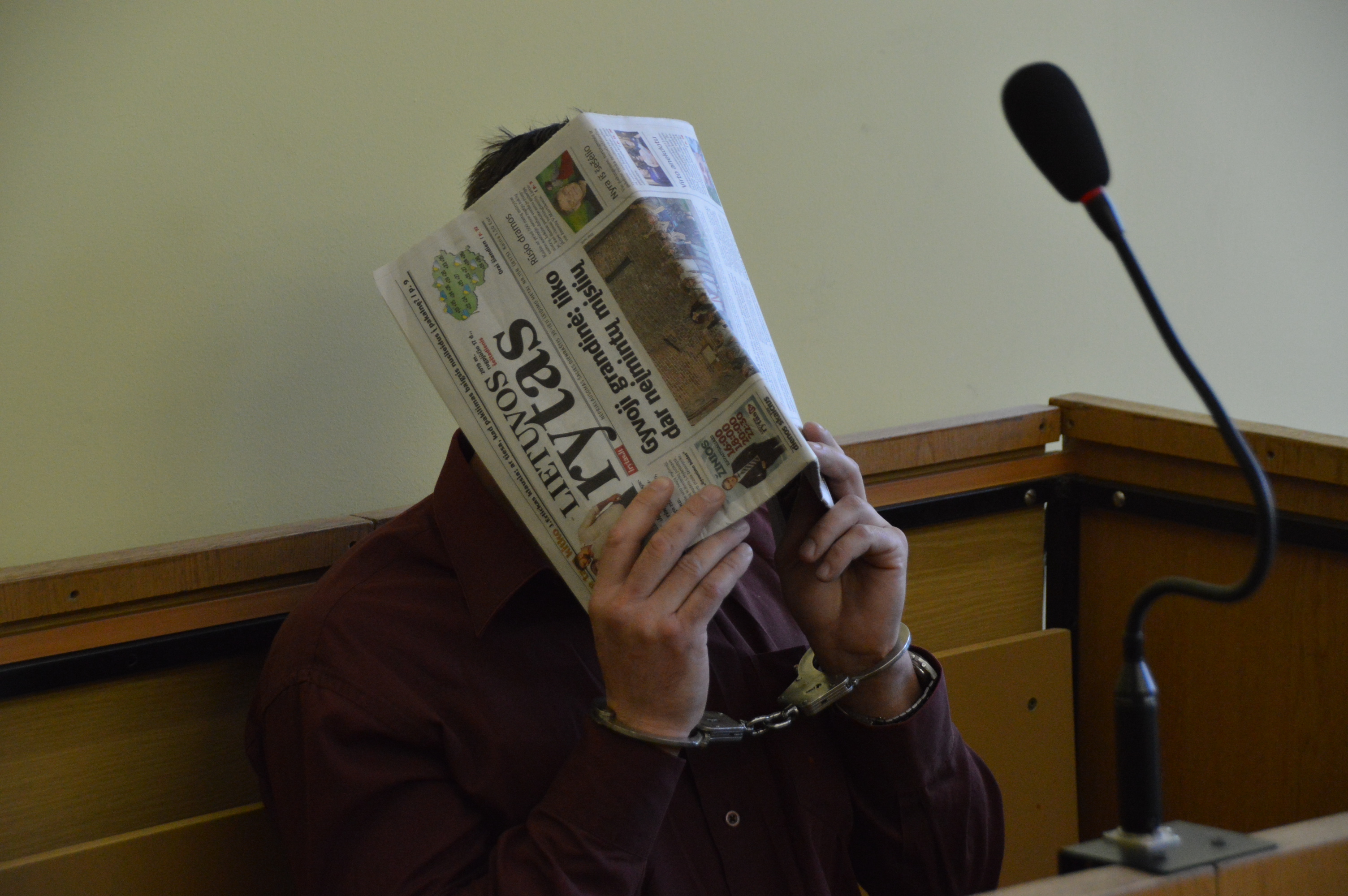 Kaltinamasis iki prasidedant bylos nagrinėjimui slėpė savo veidą. Martyno Vainoriaus nuotr.