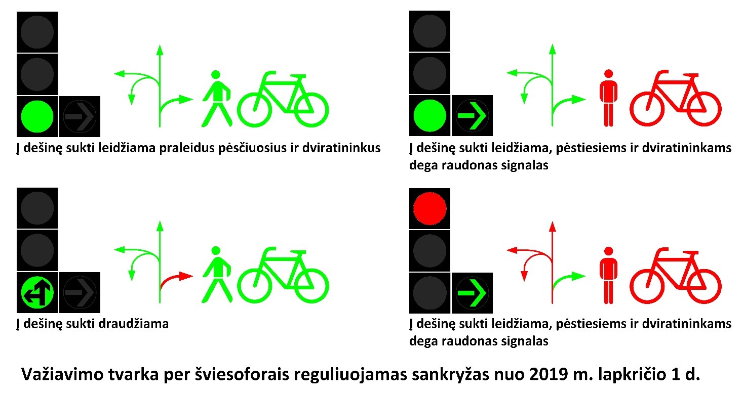 Nuo lapkričio 1-osios draudžiama kabinti naujas lenteles su žaliomis rodyklėmis, bet leidžiama įrengti šviesoforus, kurių pagrindinis žalias signalas yra be rodyklių, su papildoma sekcija į dešinę. Taip atsiranda galimybė sukti į dešinę, net jei nedega papildoma sekcija su rodykle į dešinę, tačiau tai leidžiama tik tada, jei tuo metu dega žalias skritulio formos šviesoforo signalas be rodyklių. Paprasčiau tariant, sankryžose su neatnaujintais šviesoforais, kuriuose pagrindinis žalias signalas ir toliau lieka su rodyklėmis, privaloma paisyti pagrindinio žalio signalo rodyklių krypčių: jei dega pagrindinis žalias signalas su rodyklėmis (šviesoforo signalo apskritime), o papildoma sekcija išjungta, galima važiuoti tik pagrindinio žalio signalo rodyklių kryptimis. Kai papildoma šviesoforo sekcija išjungta, bet dega pagrindinis žalias skritulio formos signalas be rodyklių, leidžiama sukti į dešinę, praleidžiant pėsčiuosius ir dviratininkus.