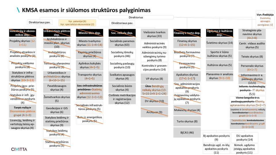 Esminis pokytis, jog naikinami visi šeši šiuo metu savivaldybėje esantys departamentai, o jų vadovai taps vyriausiaisiais patarėjais, pavaldžiais savivaldybės administracijos direktoriui ir jo pavaduotojams.