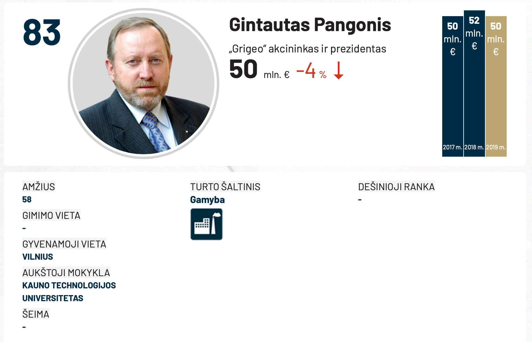 G. Pangonis yra pagrindinis įmonių grupės „Grigeo” akcininkas. Iš karto po informacijos apie prokuratūros, aplinkosaugos ir Klaipėdos policijos komisariato pareigūnų reidą „Grigeo” įmonių grupei priklausančioje „Grigeo Klaipėda” paviešinimo G. Pangonis sakė nieko apie tokį pelno didinimo per išlaidų mažinimą būdą nežinojęs. Du dešimtmečius įmonė nuodija marias, kurių vandenėliu, praskiedusiu Baltijos jūrą, skalauja burnas visi Klaipėdos pajūrį vasarą aplankyti suvažiavę lietuviai, o vienu geriausiu skelbiamas Lietuvos vadybininkas nieko nežino. Gal niekas nesiskundė, kad neskanu?