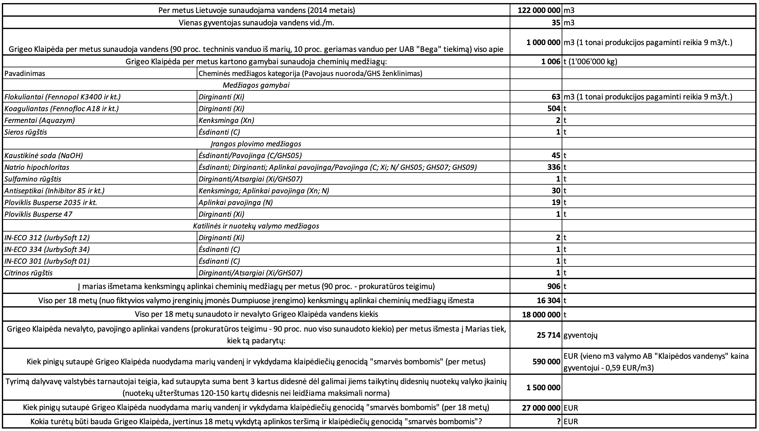 Jei AB „Grigeo Klaipėda” (buvęs „Klaipėdos kartonas”) būtų elgęsis teisėtai ir būtų mokėjęs AB „Klaipėdos vanduo” tokią pat, kaip gyventojams taikomą 1 kub. m nuotekų valymo kainą (0,59 ct), būtų per metus išleidęs 590 tūkst. EUR.