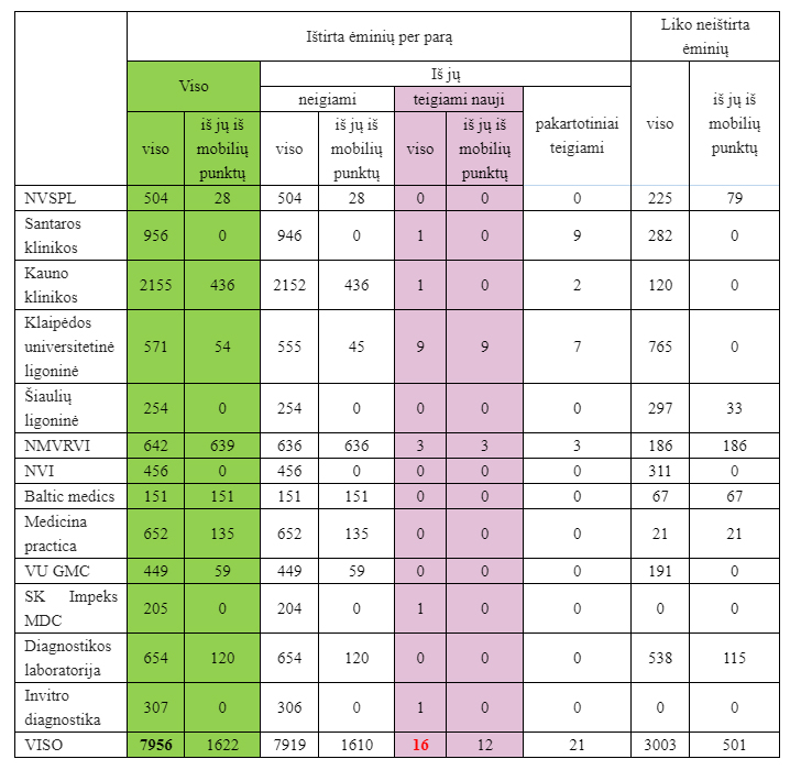 Klaipėdos universitetinės ligoninės laboratorijoje ištyrus 555 mėginius nustatyti devyni nauji susirgimo atvejai – visi teigiami mėginiai atkeliavo iš mobiliųjų punkto. Taip pat konstatuoti 7 atvejai, kai žmogus dar nepasveiko.