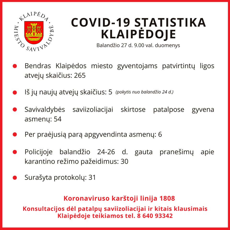 Pirmadienį popiet surengtos spaudos konferencijos metu Nacionalinio visuomenės sveikatos centro (NVSC) Vilniaus departamento vadovė Rolanda Lingienė pranešė, kad Klaipėdoje patvirtintos dvi mirtys. Patvirtinta, kad tarp jų yra šeštadieninė 58 metų vyro mirtis uostamiestyje, Karlskronos gatvėje. Kita auka – 87-erių vyras gydėsi nuo COVID-19 namie – ir į KUL buvo paguldytas tik balandžio 16 d.