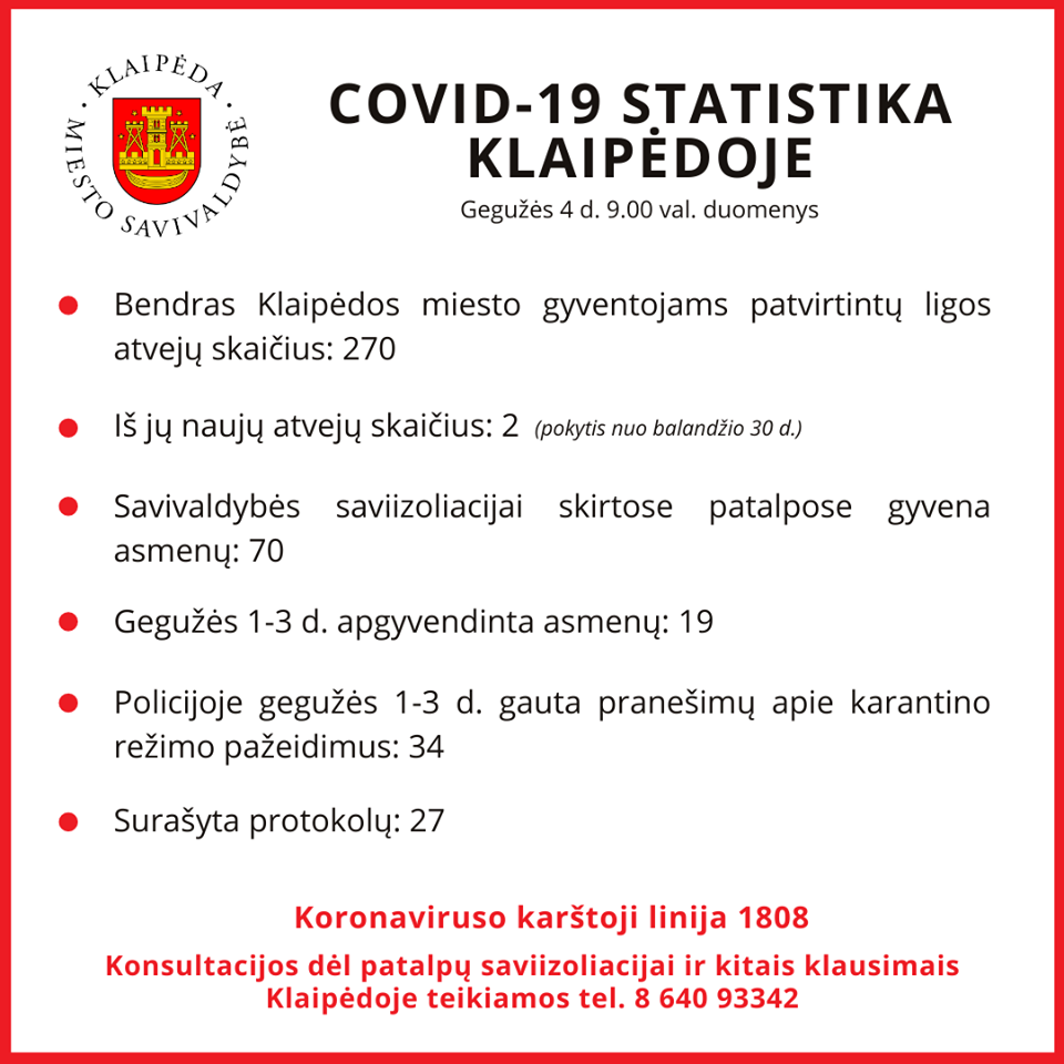 Klaipėdos savivaldybė praneša, kad nuo balandžio 30-osios iki pirmadienio ryto uostamiestyje buvo užfiksuoti tik du nauji susirgimai koronavirusu.