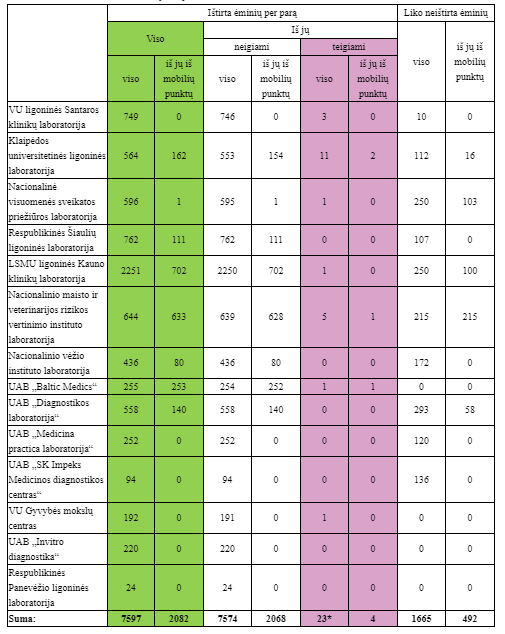 Tačiau laboratorijos teikia tik bendrą iš gautų ėminių nustatytą koronaviruso infekcijų skaičių. Į šį skaičių įeina tiek naujai nustatytieji atvejai, tiek pakartotiniai.