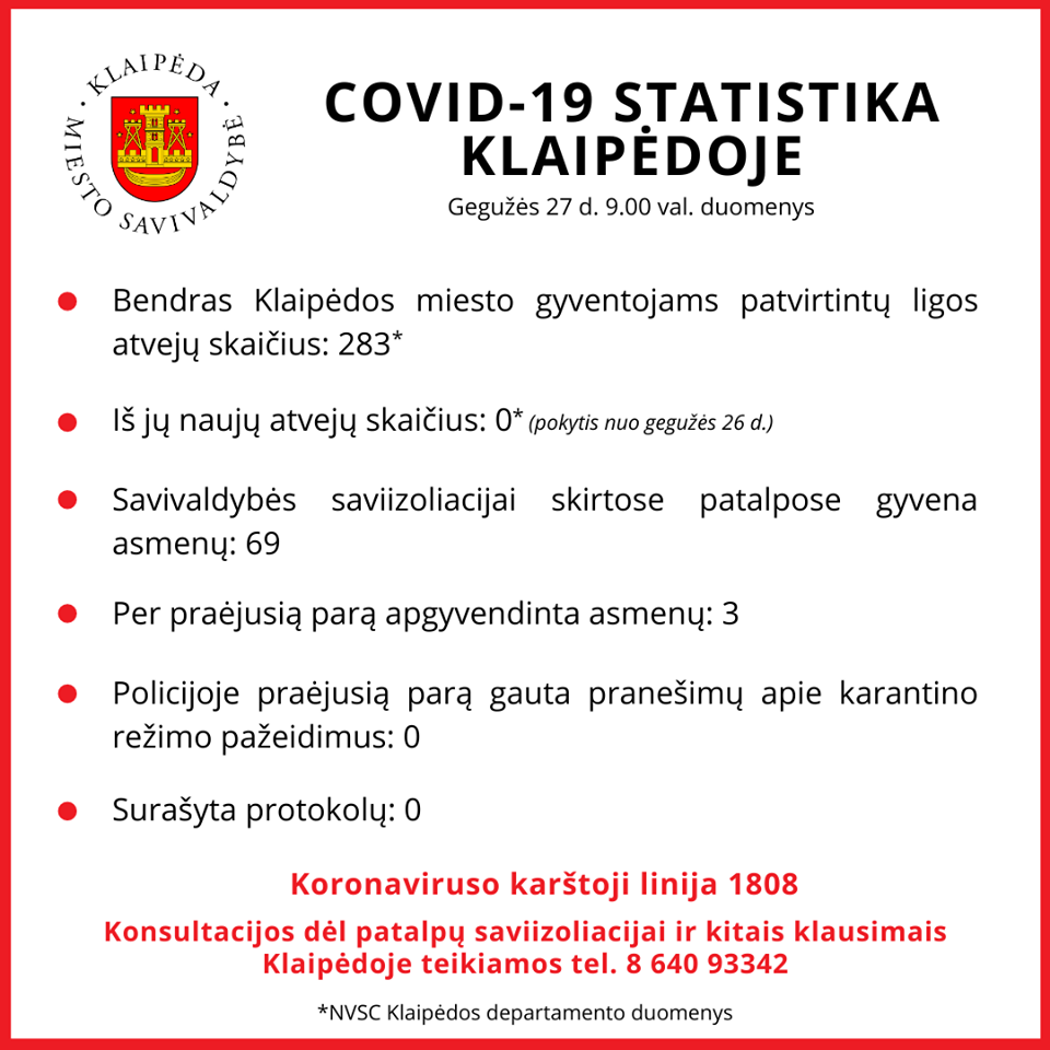 Klaipėdos savivaldybė pranešė, kad antradienį, kaip ir pirmadienį mieste naujų susirgimų COVID-19 nebuvo.
