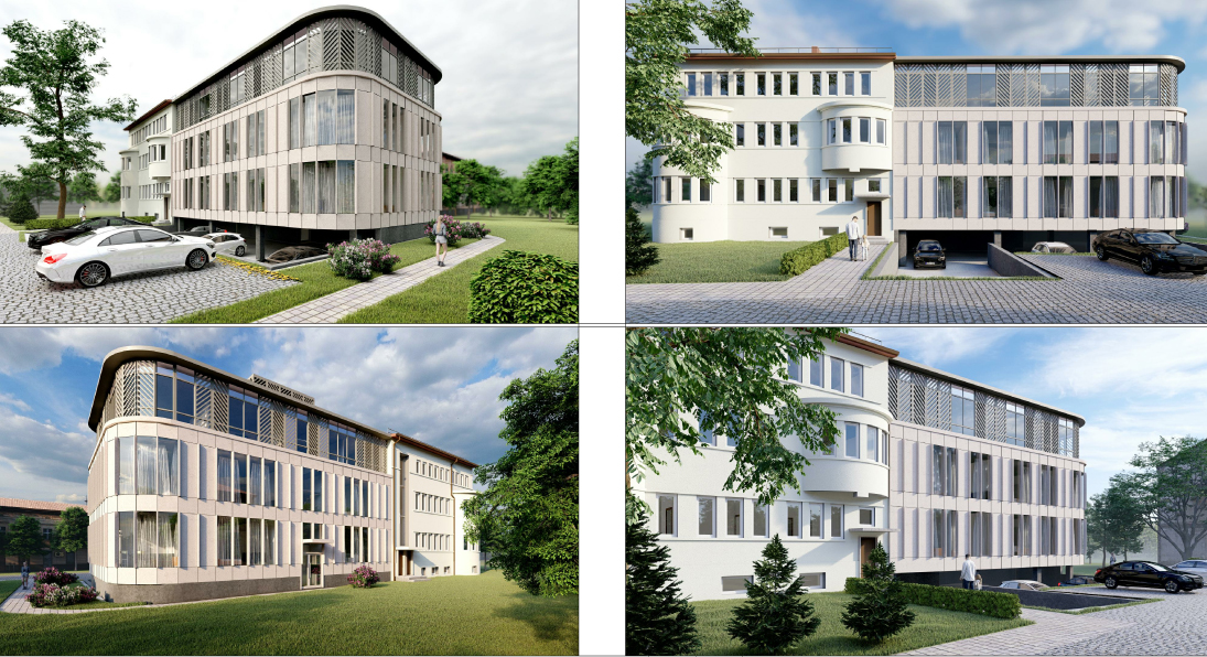 „Derinantis prie esamo administracinio pastato, fasadų apdailai parenkami šviesūs, smėlio spalvos tonai. Architektūrine idėja siekiama, išvengiant tiesioginio esamo fasado kopijavimo, šiuolaikiškomis medžiagomis ir stilistinėmis priemonėmis išsaugant esamo administracinio pastato vertingąsias savybes jas pabrėžti ir susieti su naujai projektuojamu pastatu“, – teigiama projektiniuose pasiūlymuose.