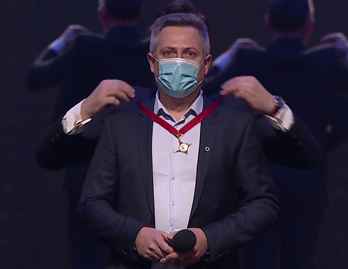 Už naujų sceninės išraiškos formų paieškas atminimo ženklas „Boriso Dauguviečio auskaras“ Lietuvos rusų dramos teatrui įteikęs klaipėdietis aktorius Darius Meškauskas linkėjo visiems teatralams, kad kuo greičiau baigtųsi kaip ir sovietmečiu „rašymas į stalčių”, kurį dabar cenzūruoja kovidas.