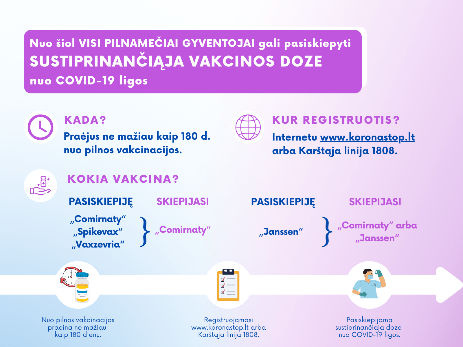 Registruotis sustiprinančiajai vakcinos dozei galima įprastu būdu: internetu www.koronastop.lt arba Karštosios linijos trumpuoju telefono numeriu 1808. Vakcinuotis taip pat galima pas šeimos gydytoją. Norėdami sužinoti, ar jų asmens sveikatos priežiūros įstaiga vykdo skiepijimą nuo COVID-19 ligos, gyventojai turėtų kreiptis į įstaigos registratūrą.