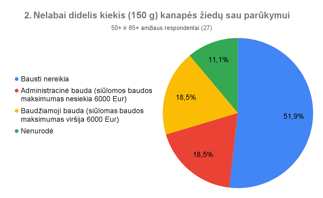 Atsakydami į pirmąjį klausimą apie baudimą už turimą mažą kiekį kanapių tik sau parūkymui, 61 proc. respondentų apskritai nematė reikalo už mažą kiekį sau parūkymui bausti žmonių. 21 proc. pasisakė už baudas nesiekiančias 6000 Eur (siūlytos baudos iki 100, iki 200, iki 500, iki 5000 Eur). Tik 11 proc. pasisakė už baudžiamojo kodekso vertas baudas (pasiūlytos iki 20000 ir iki 25000 Eur baudos). Ir likę 7 proc. nuo atsakymo susilaikė.
