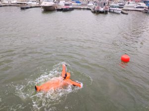 Įvykus ekstrinei situacijai gali tekti ir pačiam šokti iš laivo. Tokia ir buvo pirmoji visų „Vandens kelio 55“ užduotis – šokti nuo krantinės, vėliau – plaukti prie nusileidimo virvės, atlikti hiperventiliacijos pratimus, panėrus palei nusileidimo virvę ištraukti iš kelių metrų po vandeniu padėtą objektą, lipti iš vandens virvinėmis kopėčiomis į laivą, Ne vienam mokymo dalyviui tai buvo tikras, sunkiai įveikiamas iššūkis.