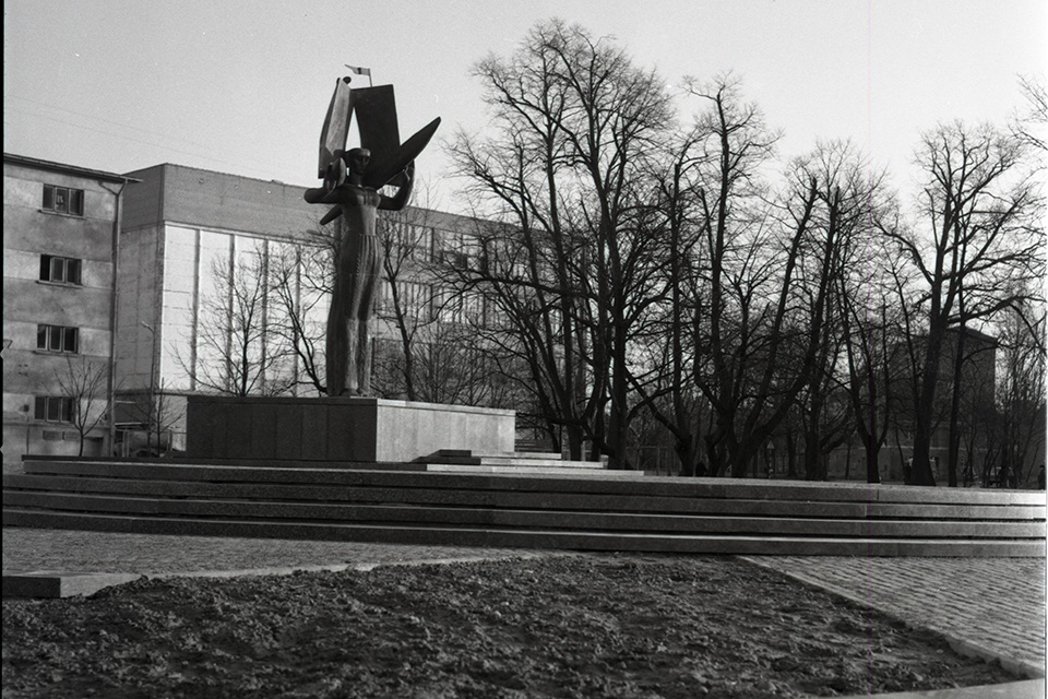 Dalios Matulaitės ir architekto Rimanto Buivydo skulptūra „Neringa“ skvere prie Bangų gatvės ir Taikos prospekto susikirtimo. Bernardo Aleknavičiaus (Klaipėdos apskrities Ievos Simonaitytės viešosios bibliotekos archyvas) nuotr.