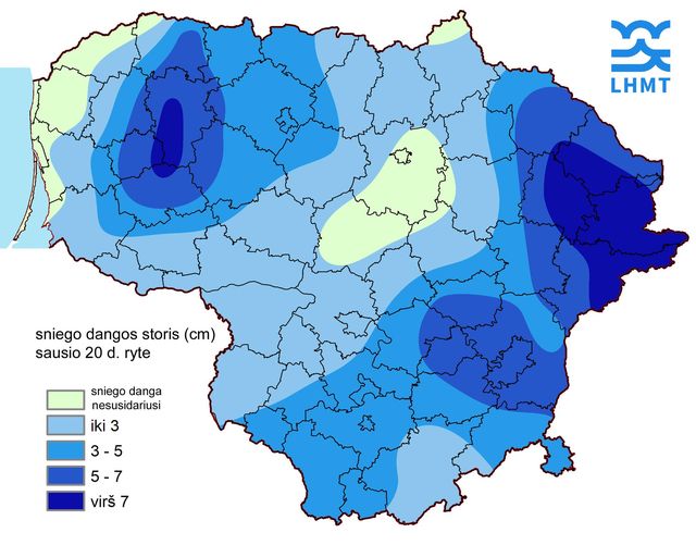 Tuo tarpu sniego dangos nėra arčiausiai pajūrio esančiose vietovėse, šiaurės vakariniame šalies pakraštyje, Dotnuvos ir Panevėžio apylinkėse bei šiauriau Biržų.