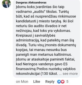 Tuo metu vicemeras Narūnas Lendraitis teigė, jog negalima lyginti kitose savivaldybės įstaigose ir įmonės atliktų auditų su pastaruoju.
