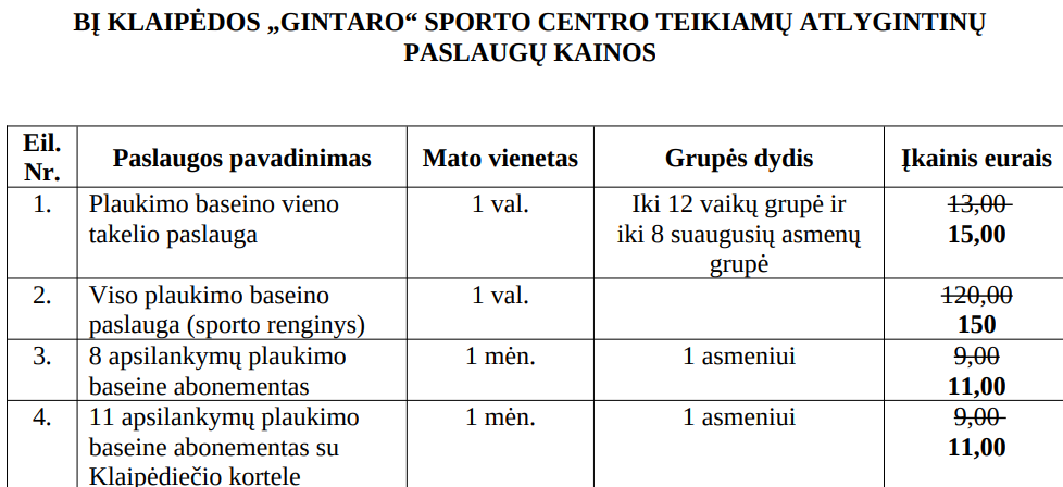 Siūloma patvirtinti perskaičiuotus „Gintaro“ sporto centro, Klaipėdos miesto lengvosios atletikos mokyklos ir Vlado Knašiaus krepšinio mokyklos teikiamų atlygintinų paslaugų kainas, kurios ir iki šiol buvo mažinamos 50 proc. sporto organizacijoms, įgyvendinančioms buriavimo, irklavimo, baidarių ir kanojų irklavimo ir futbolo sporto šakos motyvuojančią sporto krepšelių programas.