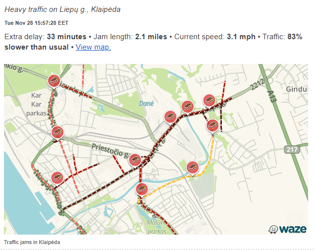 Programėlės Waze duomenimis eismas Liepų g. prieš 16 val. buvo 83 proc. lėtesnis bei įprastai.
