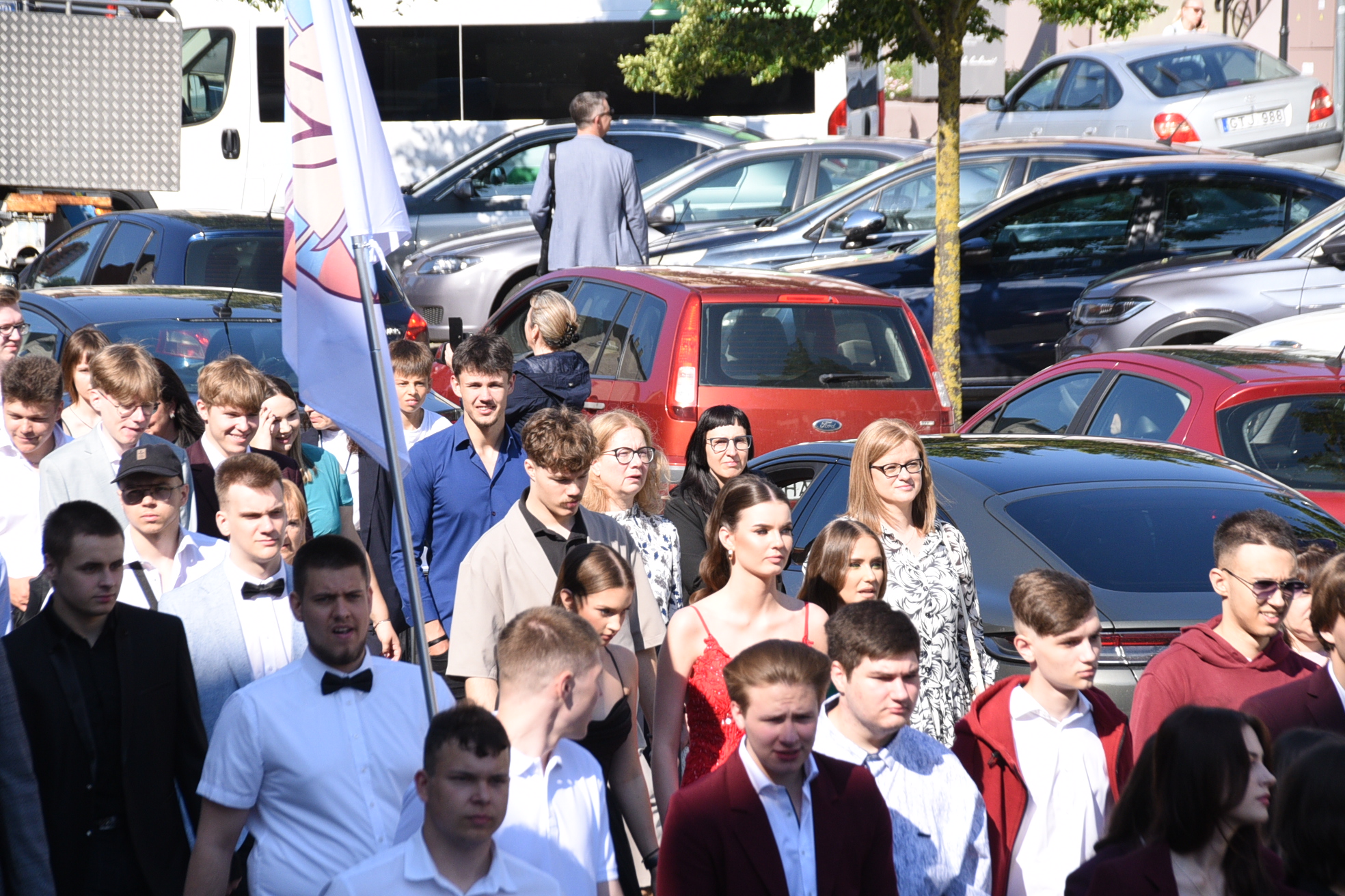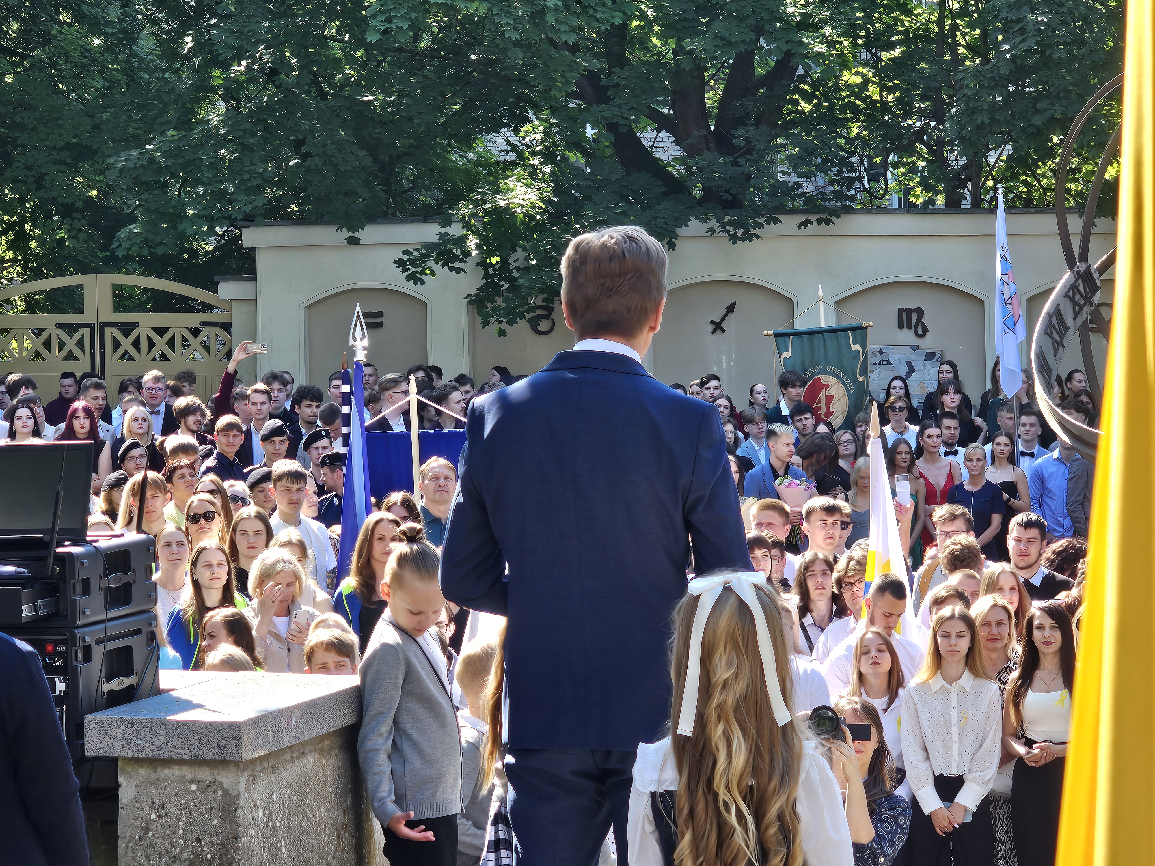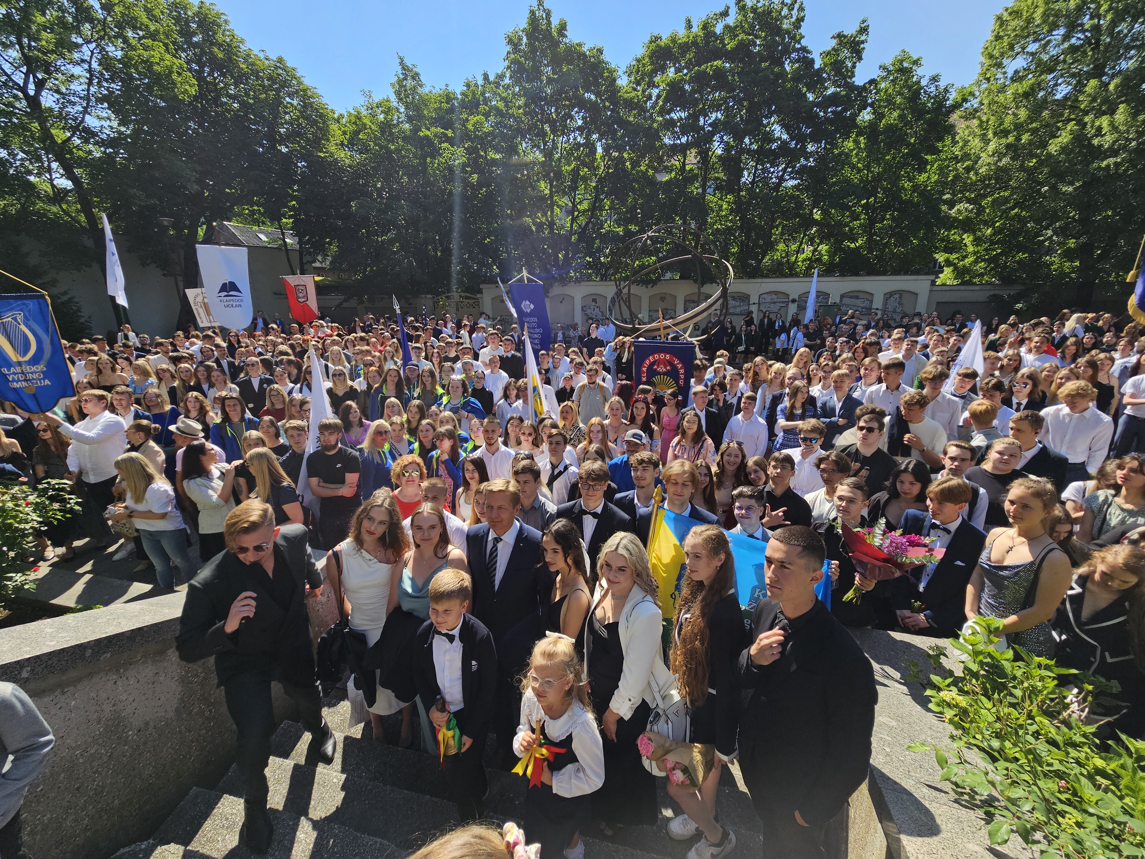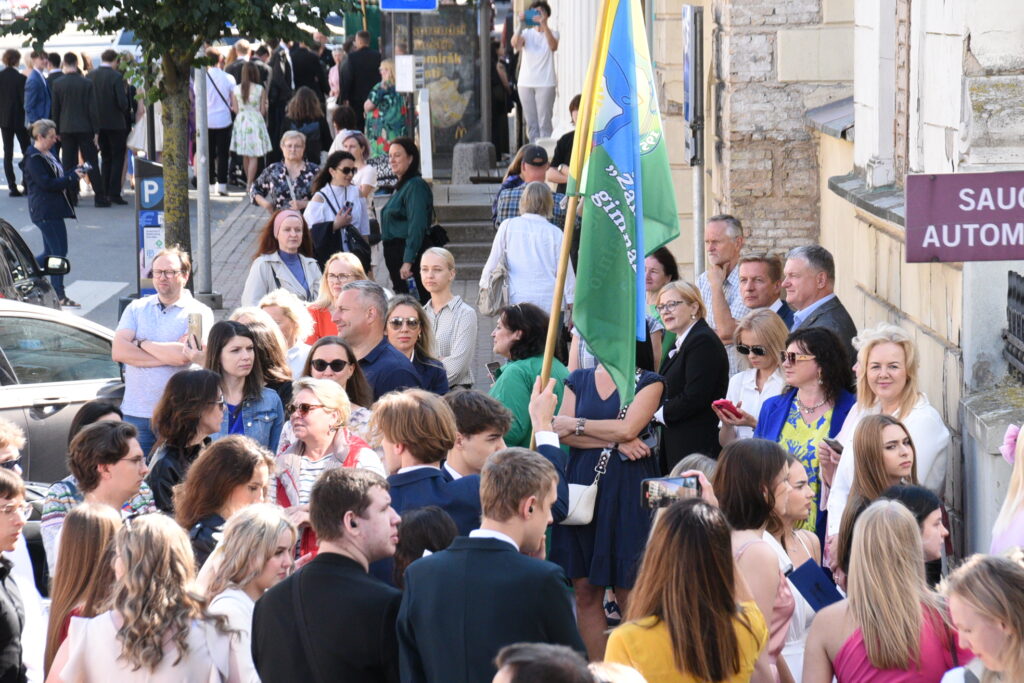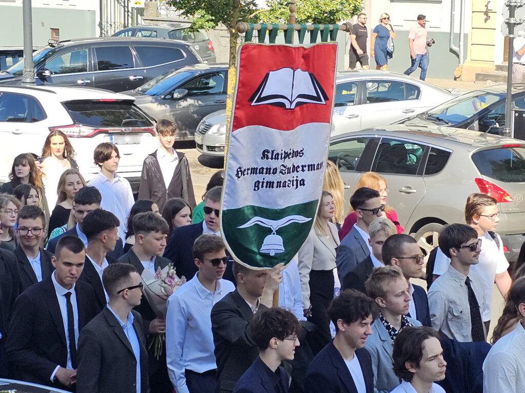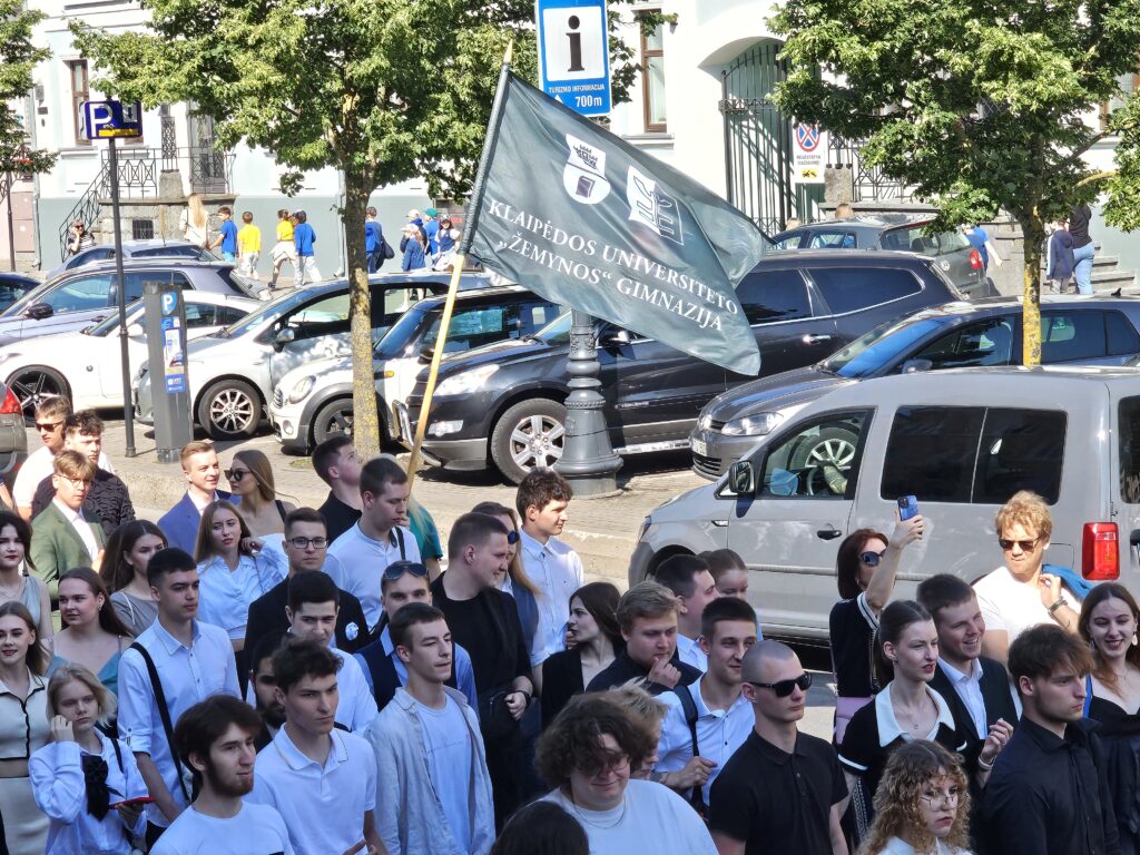 Pirmadienio rytą nuo Lietuvininkų aikštės pražygiavę Klaipėdos abiturientai tradiciškai paskutinio skambučio proga susirinko į Laikrodžių muziejaus kiemelį, kur juos pasveikino Klaipėdos meras Arvydas Vaitkus.