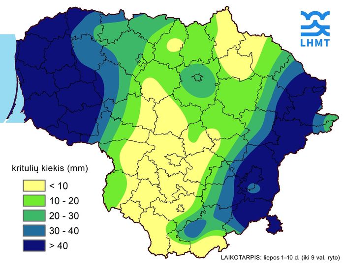Pirmasis liepos dešimtadienis pažymėtas nemažais kritulių kiekio skirtumais. Pietvakariniuose, centriniuose ir dalyje šiaurinių rajonų palijo labai mažai. Tuo tarpu Vakarų Lietuvoje ir dalyje Rytų Lietuvos jau yra pasiekta virš pusės liepos normos. Remiantis šios dienos duomenimis, Lietuvoje vidutiniškai iškrito (26,9 mm) ~33 % liepos mėn. kritulių normos. Skirtumai tarp sausiausių ir drėgniausių šalies vietovių siekia net iki keliasdešimt kartų, skelbia Lietuvos hidrometeorologijos tarnyba.