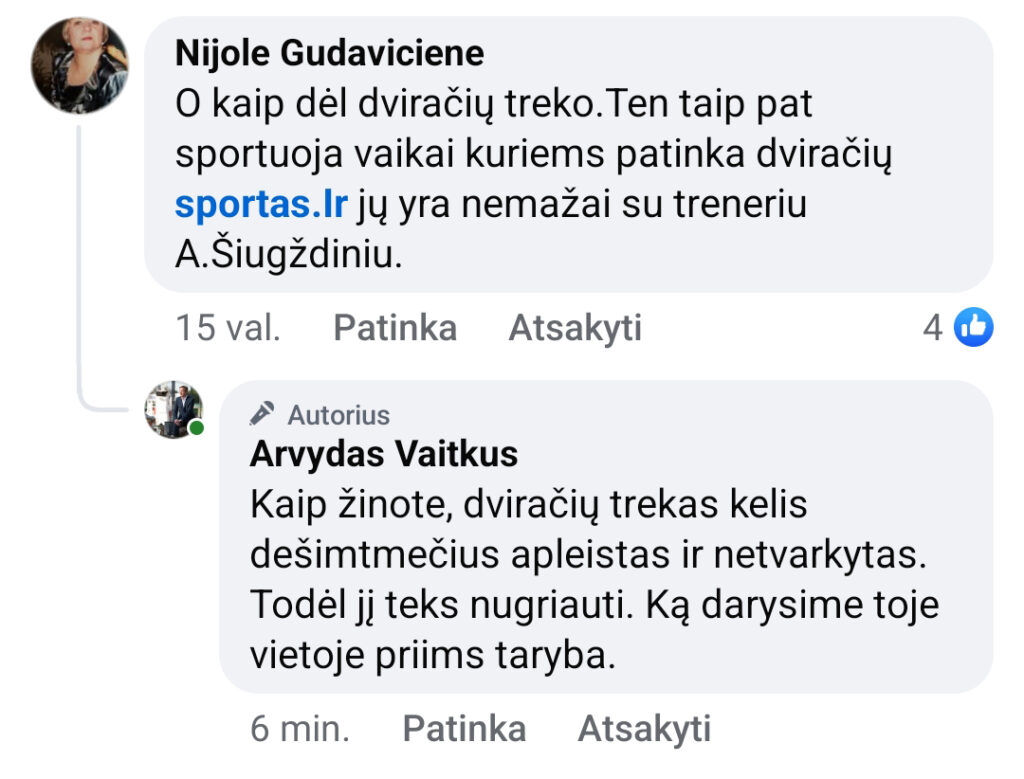 „O kaip dėl dviračių treko. Ten taip pat sportuoja vaikai, kuriems patinka dviračių sportas. Ir jų yra nemažai su treneriu A. Šiugždiniu“, – po mero įrašu apie susitikimą su premjeru Gintautu Palucku parašė viena klaipėdietė ir sulaukė miesto vadovo atsakymo.