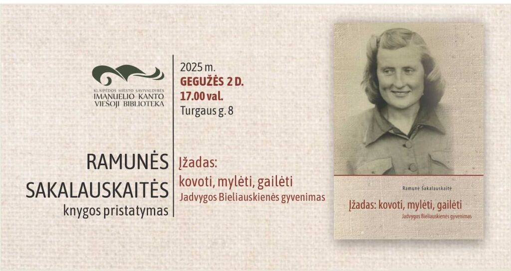 Gegužės 2 d., penktadienį, 17 val., Klaipėdos miesto savivaldybės Imanuelio Kanto viešojoje bibliotekoje (Turgaus g. 8) vyks Ramunės Sakalauskaitės knygos „Įžadas: kovoti, mylėti, gailėti. Jadvygos Bieliauskienės gyvenimas“ pristatymas. Renginio viešnia – aktorė Virginija Kochanskytė.
