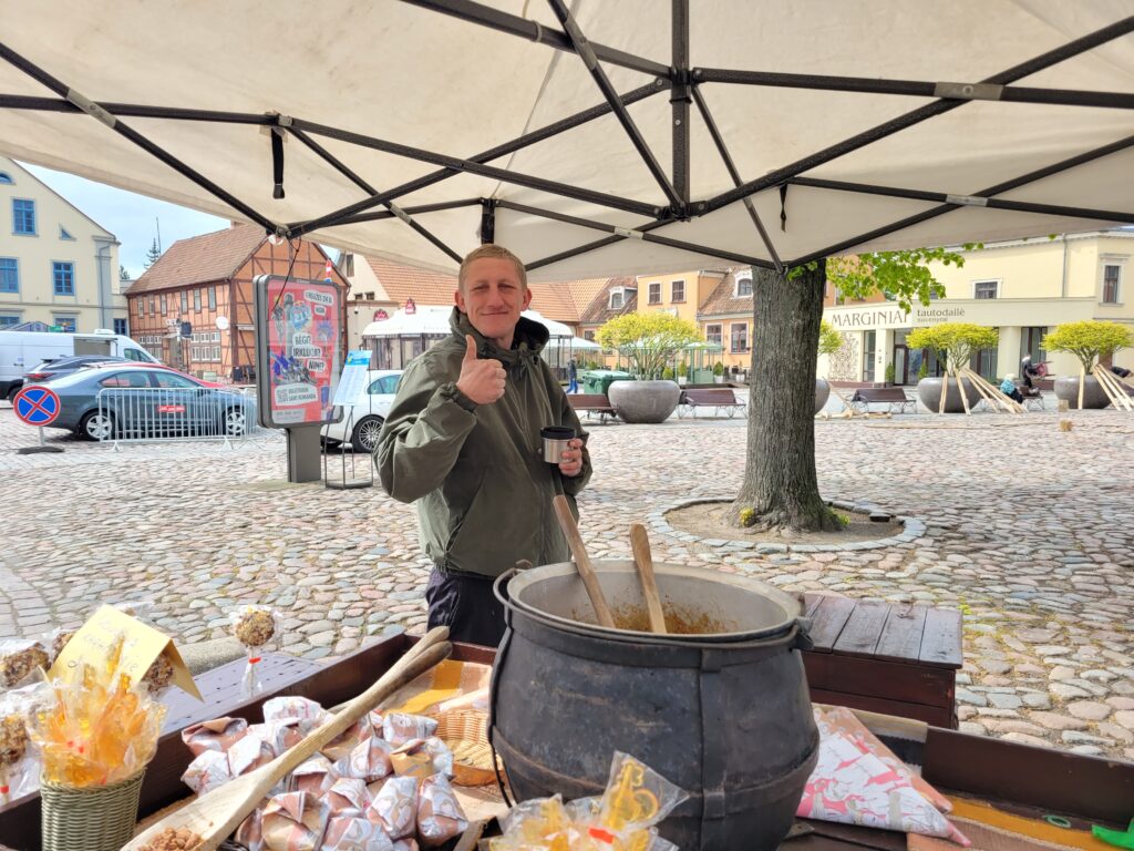Optimizmu žemietei nenusileido ir prekeivis iš Rygos, pardavinėjantis įvairius saldumynus. Jis potencialius pirkėjus ragauti jo skanėstų irgi ragino gražia lietuvių kalba.
