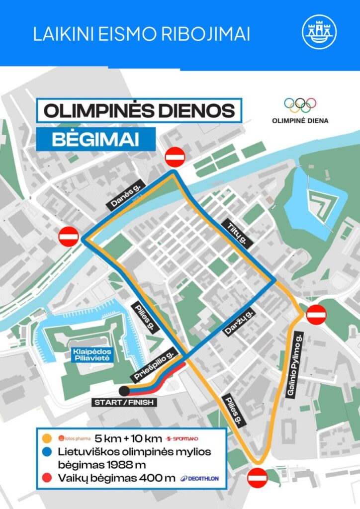 Pilies g.: bėgimo metu eismas draudžiamas. Sankirtos su Galinio Pylimo g., Daržų g., Žvejų g. bus uždaromos tvoromis.