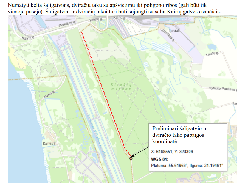 Klaipėdos miesto savivaldybė tai pat yra paskelbusi viešojo pirkimo konkursą dėl privažiuojamojo kelio atkarpos nuo Kairių gatvės iki Kairių poligono techninio darbo projekto parengimo ir projekto vykdymo priežiūros paslaugos. Numatoma, jog šios paslaugos savivaldybei turi būti suteiktos per 15 mėnesių. Gatvės projektavimo užduotis, kurią suformavo Klaipėdos savivaldybė, nėra viešai prieinama, su ja gali susipažinti tik registruoti viešųjų pirkimų portale asmenys – pirkimo vykdytojai ir paslaugų teikėjai.