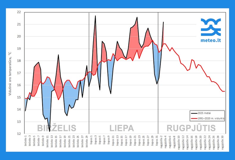Nors kaip ir kasmet šiemet nemažai pasitaikė temperatūros svyravimų, tačiau karštų dienų kol kas buvo nedaug, dažnai vyravo artima daugiametei normai temperatūra. Vidutinė birželio 1 – liepos 31 d. laikotarpio oro temperatūra Lietuvoje siekė 17,1 °C (standartinė klimato norma 1991-2020 m. to paties laikotarpio irgi yra 17,1 °C). Taigi, kol kas šios vasaros oro temperatūra visiškai atitinka klimatinę normą: birželis buvo truputį vėsesnis, o liepa – truputį šiltesnė nei turėtų būti. Per du mėnesius 33 vasaros dienos iš praėjusių 61 buvo šiltesnės už daugiametį vidurkį.