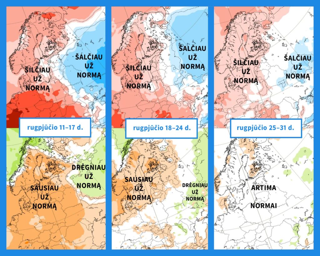 Remiantis naujausiais ECMWF modelio skaičiavimais, prognozuojama, kad rugpjūčio temperatūra bus iki 0,5–1 laipsnio aukščiau normos, o mėnesio kritulių kiekis – iki 10–15 % mažesnis už 1991–2020 m. vidurkį, skelbia Lietuvos hidrometeorologijos tarnyba.