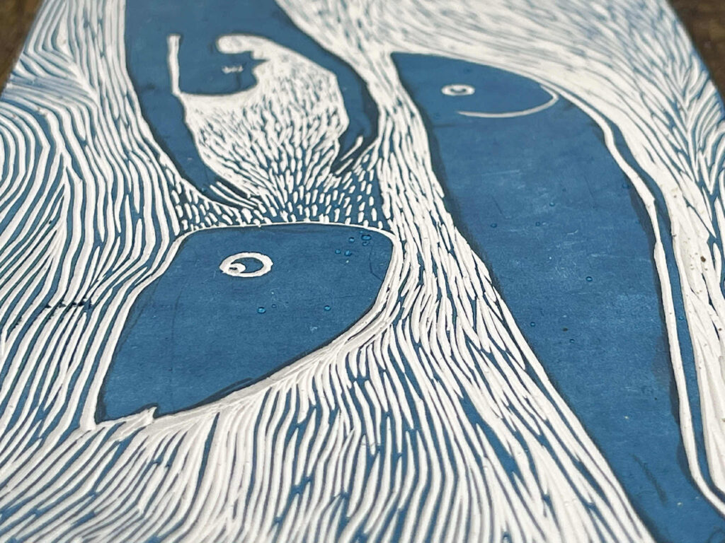 Ugnė Rudinskaitė – grafikos dizainerė, iliustruotoja Klaipėdos lėlių teatre nuo 2021 m., prieš metus iš Kauno atsikėlė gyventi į pajūrį. Parodoje pristatomi naujausi jos lino ir kartono raižiniai sukurti per pastaruosius metus. Autorės miestietiška juodai balta grafika tapo gamtiškesne ir spalvingesne.