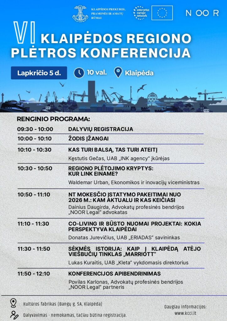 „Verslo konferencija skirta Klaipėdos regiono plėtros potencialui ir turimoms ambicijoms aptarti, sužinoti apie artimiausius pokyčius renkantis regiono plėtojimo kryptis ir pakeitimus mokesčių įstatymų nuo 2026 m. srityje. Be valdžios institucijų sprendimų, kurie veikia tiek privačias, tiek viešąsias investicijas, siekiama pristatyti ir praktinius regiono centro – Klaipėdos – plėtros aspektus“, – teigia V. Krolis.