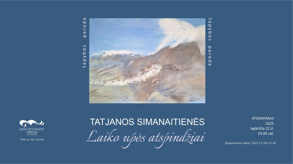 Lapkričio 22 d., 14 val., Klaipėdos miesto savivaldybės Imanuelio Kanto viešosios bibliotekos Girulių padalinio galerijoje bus atidaroma tapytojos Tatjanos Simanaitienės paroda „Laiko upės atspindys“.