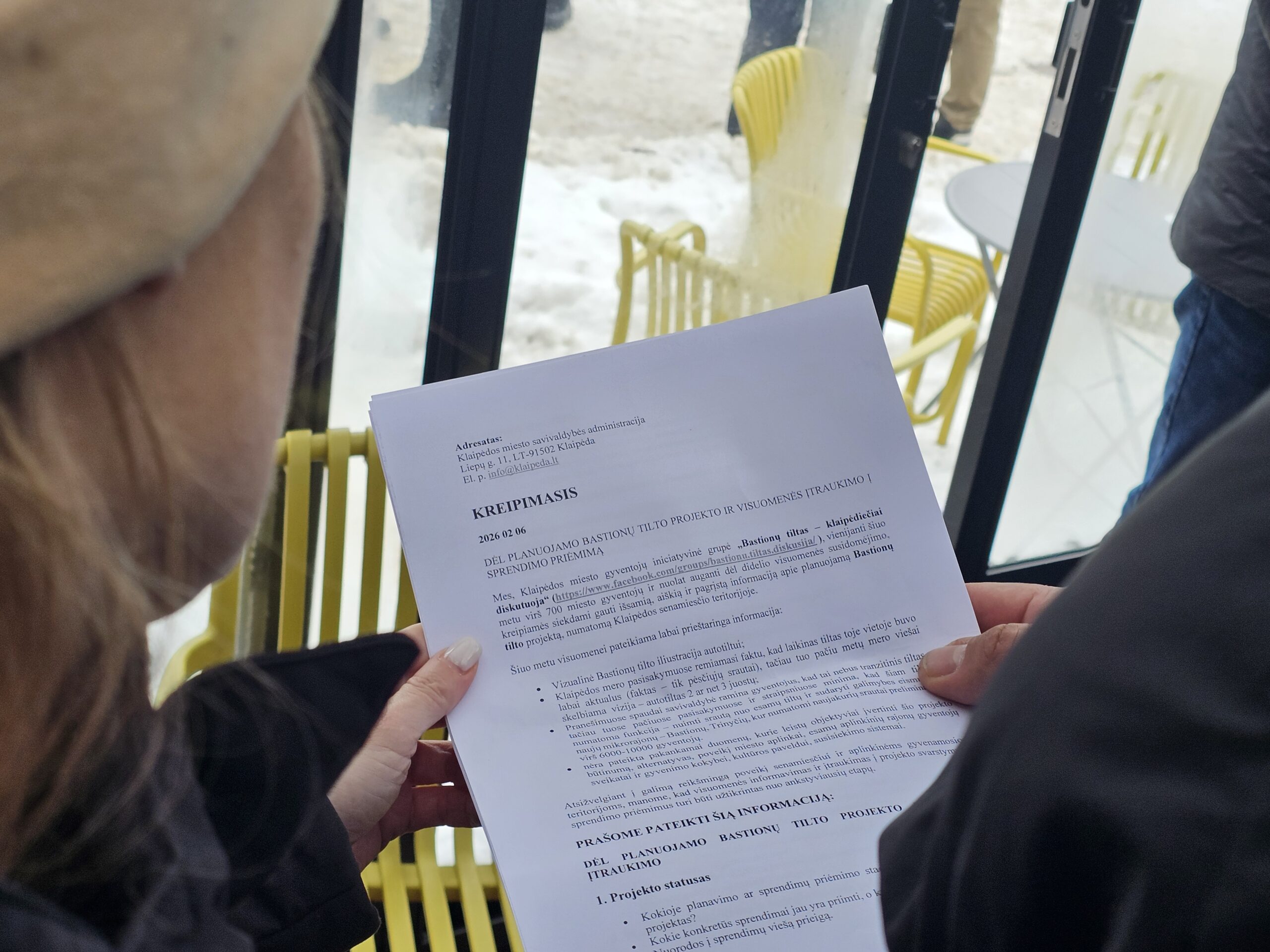 Penktadienio vidurdienį dešimtys klaipėdiečių traukė į Dangės skvere esančią kavinę, kad padėtų parašus po iniciatyvinės grupės, pasisakančios prieš tai, kad naujasis Bastionų tiltas būtų skirtas ir automobiliams, sukurtu kreipimosi į Klaipėdos savivaldybę raštu.