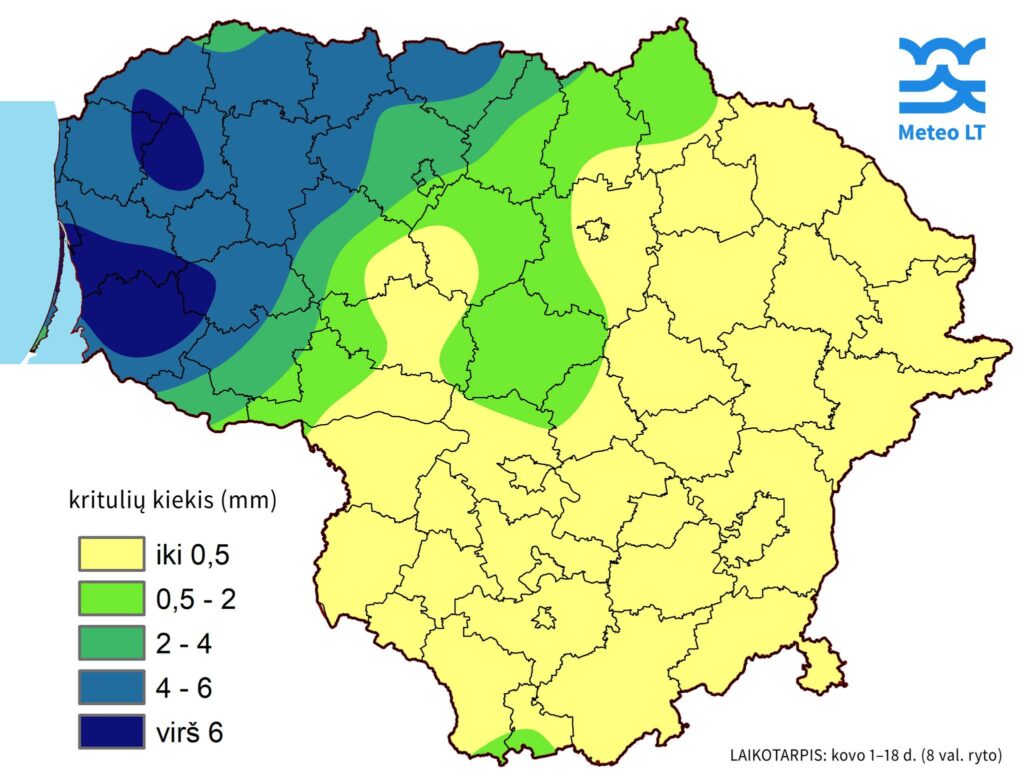 Kovo 1–18 d. laikotarpiu daugiausia kritulių iškrito: