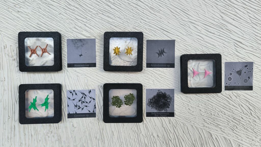Kiekvienas darbas parodoje tampa savarankiška mikrosistema. „Planetos plaučiai“ primena, kad fitoplanktonas pagamina daugiau nei pusę Žemės deguonies, o jo struktūros primena žmogaus kvėpavimo sistemą. „Jūros gyvybė ausyse“ perkelia mikroskopinius organizmus į papuošalo funkciją, leisdama žmogui nešioti tai, ko paprastai nemato, bet nuo ko priklauso jo egzistencija. „Diacyclops“ tyrinėja formą ir jos ritmą, jungdamas mokslinį tikslumą su grafičio estetika. „Lašas“ kalba apie tai, kas telpa viename vandens laše – ne metaforiškai, o tiesiogine prasme. „Jūros atspaudai“ fiksuoja gyvybės pėdsakus, kurie paprastai išnyksta vos tik vanduo nuslūgsta. „Morfogenezė: Jūra“ tyrinėja formos ir detalės santykį, perkeldama mikroorganizmus į auskarų struktūrą. „Būtinybė“ primena, kad nematomi dumbliai palaiko mūsų gyvybės pamatą. „Švytintys duomenys“ jungia literatūrą ir mikropasaulio ritmą, o „Nematomų sistemų topologijos“ kuria vizualinę laboratorijos ir gamtos jungtį. „Pažeista pusiausvyra“ kalba apie žmogaus veiklos įspaudą gamtoje, o modifikuotas Rubiko kubas tampa metafora žmogaus bandymui kontroliuoti tai, ko iki galo nesupranta.
