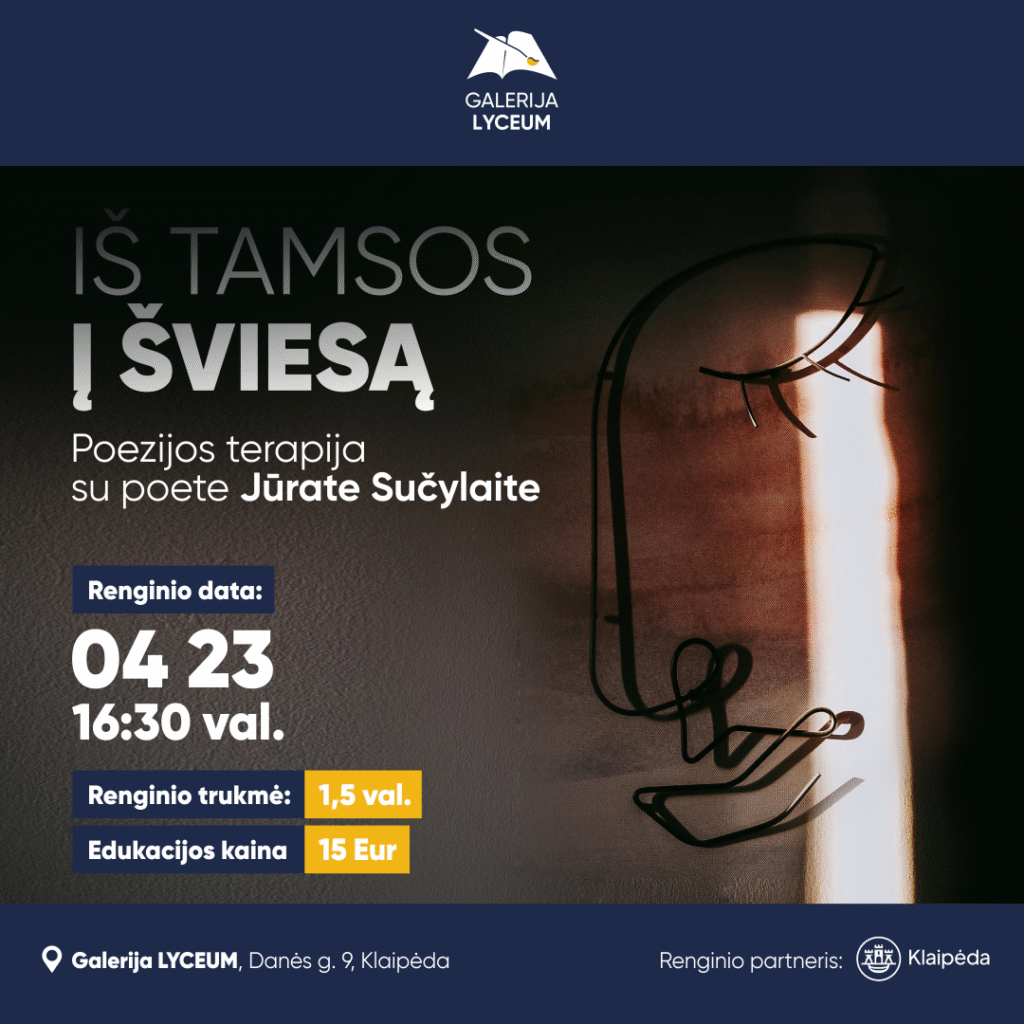 Balandžio 23 d, ketvirtadienį, 16.30 val., „Lyceum“ galerijoje (Danės g. 9) vyks poezijos terapija „Iš tamsos į šviesą“ su poete ir prozininke Jūrate Sučylaite.
