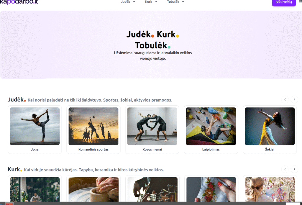 Po kategorija „Judėk“ slepiasi sportas, šokiai ir aktyvios pramogos. Jei viduje kirba kūrėjas ir domina tapyba, keramika ar kitos meninės veiklos – tam skirta kategorija „Kurk“. O norintiems augti, mokytis ar lavinti naujus įgūdžius – siūloma kategorija „Tobulėk“, kurioje – kursai, saviugdos ir įvairūs edukaciniai užsiėmimai. Veiklas galima rinktis ne tik pagal kategoriją, bet ir pagal miestą, todėl išsirinkti savo būsimą hobį tampa dar paprasčiau.